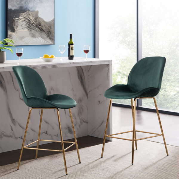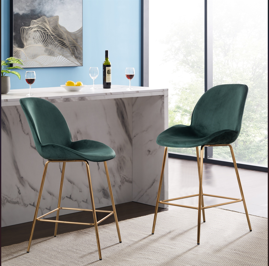 Enjoy a meal or two with the family with these modern Counter Stools pulled up to your Island. Four tapered and splayed metal legs support the Stool in mid-century modern style. The full-back and seat have rounded edges and curved sides to create a modern wingback silhouette. Upholstered in velvet and foam-filled, these Bar Stools will be a stylish addition to your dining ensemble.