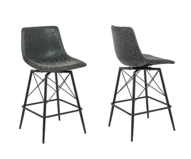 Introduce mid-century modern style into your bar area with this set of two bar stools, featuring a robust metallic structure and faux-leather upholstery. Floor protectors prevent the legs from scratching your hardwood floors, making this design extra convenient. Swiveling functionality offers flexibility and practical use.